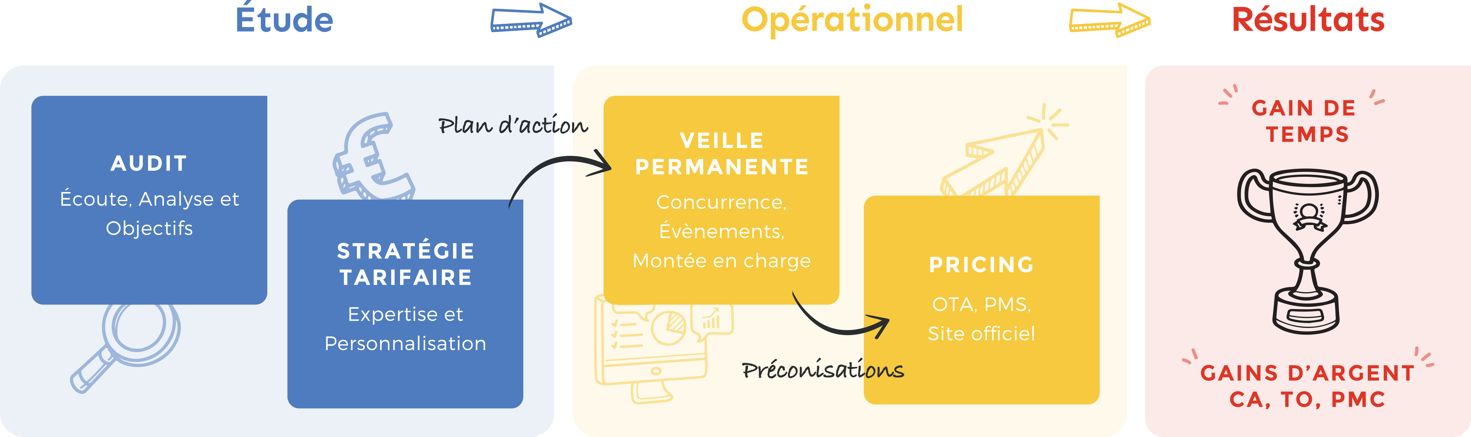 Optim’Resa a élaboré une méthodologie puissante et efficiente basée sur l’expérience terrain. Nos consultantes en revenue management sont en veille permanente pour agir au quotidien sur le pricing des établissements qu’elles gèrent. Ecoute, disponibilité, expertise, conseil sont les compétences qui manifestent le succès des établissements pilotés par nos revenue managers. Chez Optim’Resa by My Groom Service, cette relation professionnelle est basée sur l’échange humain.